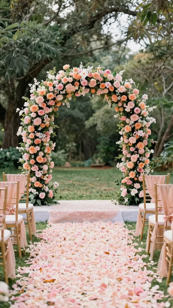 – Create delicate floral arches for your ceremony using pink and peach blooms