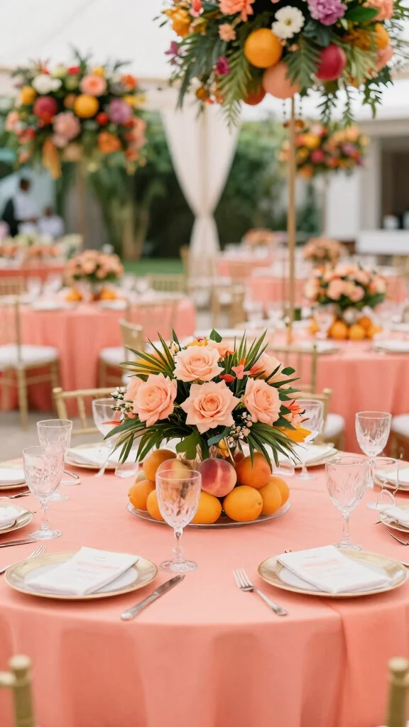 Use coral napkins alongside peach table settings to create a fun atmosphere. Add tropical fruits like peaches and oranges into your centerpieces for a playful touch that will delight your guests. This combination is full of life and happiness!