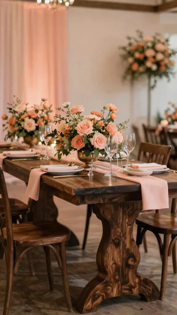 Enhance your floral arrangements with peonies, roses, and dahlias in these colors. Adding fabric accents like table runners or chair sashes can effortlessly tie the shades together. Mixing and matching peach and pink will create a perfect blend of romance and freshness.