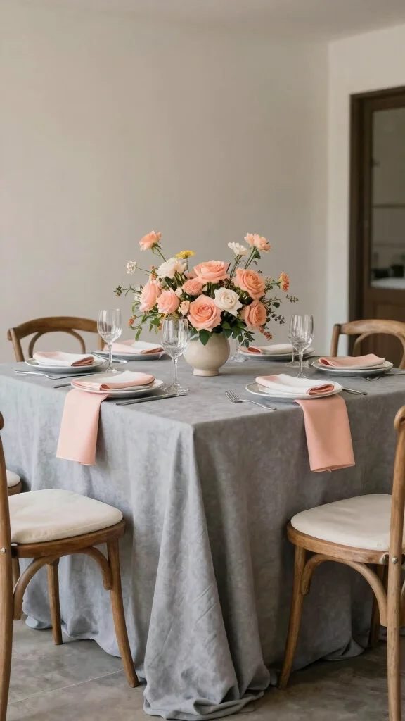 Use gray bridesmaid dresses with peach bouquets for a stylish look. Incorporate gray linens alongside peach centerpieces to create a cohesive design. This combination is effortlessly elegant and chic.