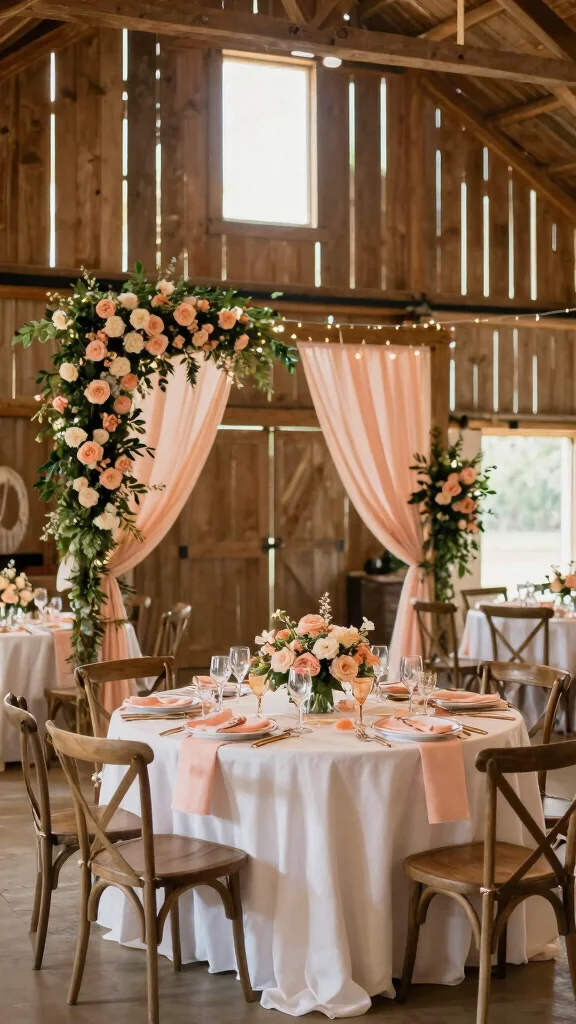 For a rustic barn vibe, start with a soft base like ivory or cream and layer in peach tones that read warm rather than bright. A classic peach wedding palette combines peach with ivory, sage green, and natural wood textures. Add subtle metallic accents with peach and gold wedding decor to keep it elegant. Try these sample palettes: 1) Peach + ivory + sage + light wood; 2) Peach + blush + taupe + gold. Practical tips: choose seasonal peach blooms (peach roses, peonies, ranunculus), use burlap or linen accents, and incorporate wooden signage. This helps the look stay cohesive and not overly pastel.