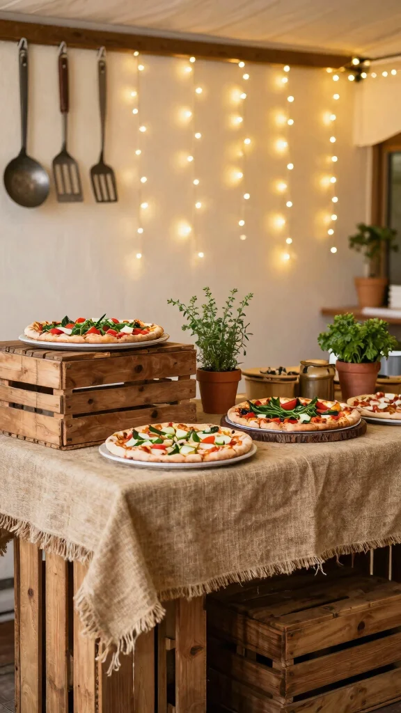 Imagine a pizza bar that radiates warmth and charm! With wooden crates and twinkling fairy lights, your guests will feel right at home. This rustic setup not only tastes delightful but also nourishes the spirit of togetherness, making it perfect for your celebration.