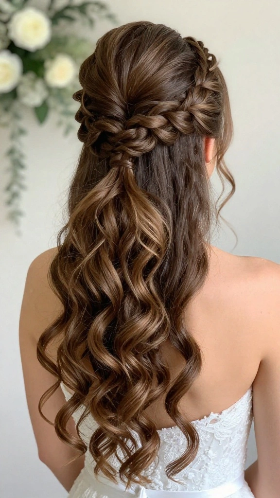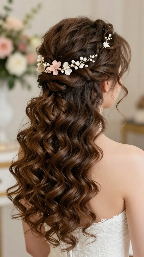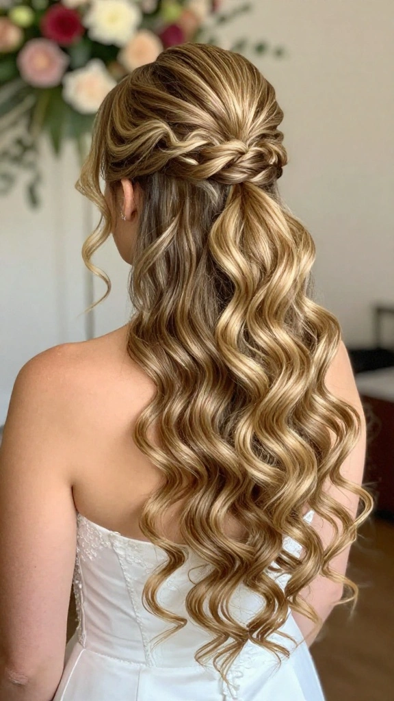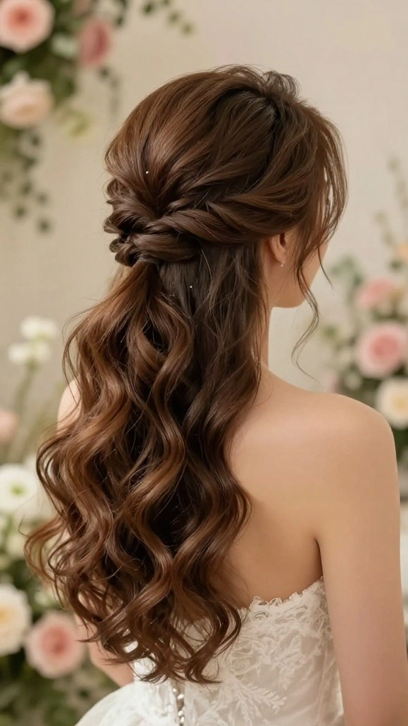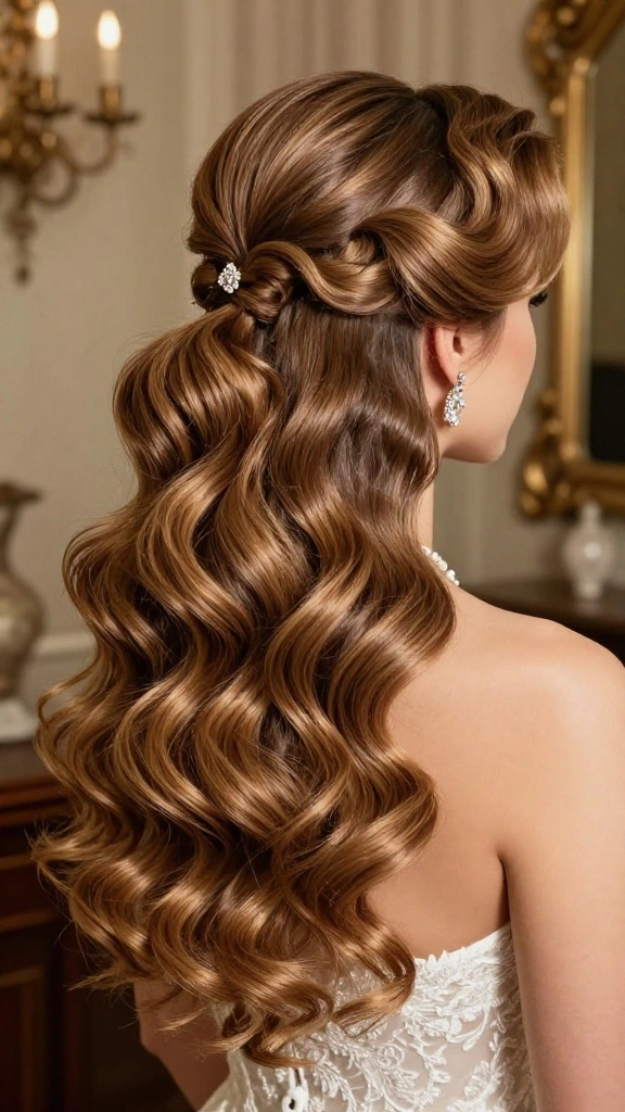 Try a half-up ponytail with cascading waves for a romantic and soft appearance that suits traditional themes.