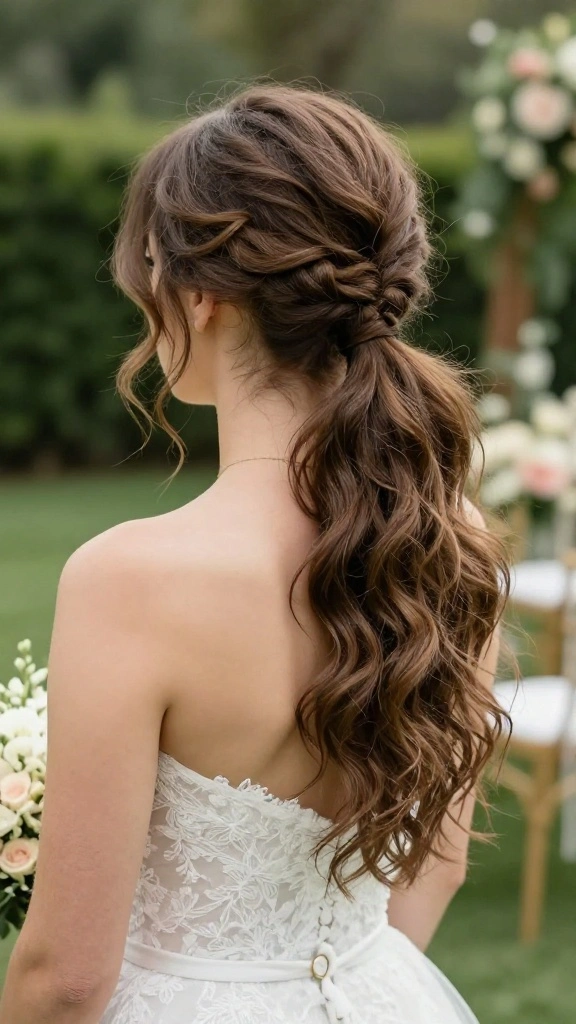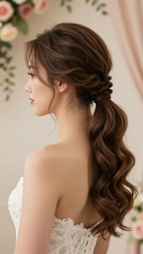 This hairstyle combines elegance with playfulness, making it ideal for brides wanting a unique twist on the traditional ponytail.