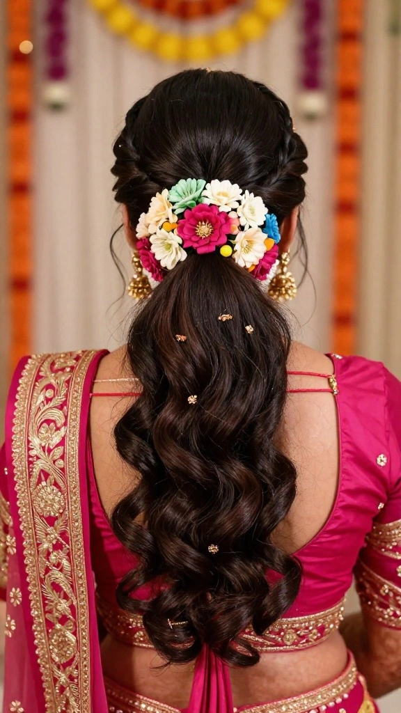 Begin by curling sections of your hair with a curling iron or rollers, then gather them into a ponytail, allowing tendrils to fall around your face. This style works well with floral or jeweled hair accessories, complementing your bridal outfit perfectly.