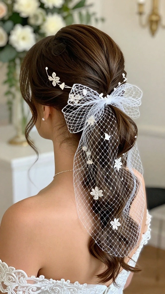 Wrap your ponytail with beautifully crafted netting that aligns with your wedding attire, creating a stunning visual effect. This hairstyle is perfect for brides wanting to stand out while maintaining a chic appearance.