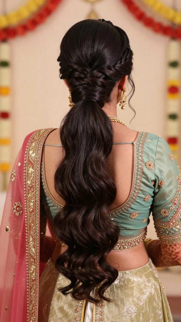 The twisted ponytail presents a delightful mix of classic elegance and modern flair, making it a wonderful option for Indian weddings. This style incorporates twists from either side of your head, secured at the back for a refined appearance. The addition of a small braid adds texture and uniqueness to your look.
