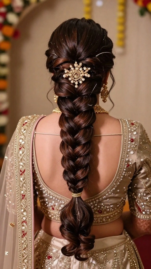 Gather your hair back into a ponytail and attach the paranda, which can be intricate and colorful, reflecting your cultural heritage. This hairstyle is perfect for brides wanting to embrace tradition while remaining stylish.