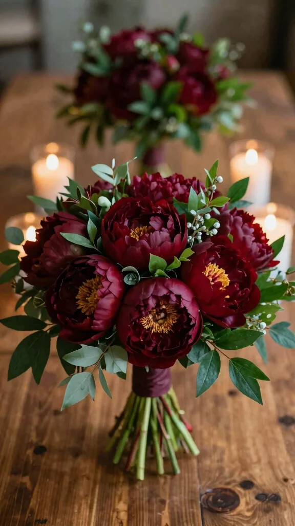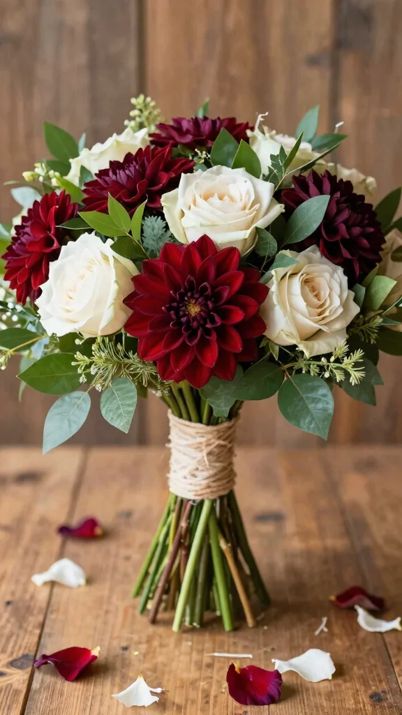 – Bouquets filled with deep red blooms mixed with soft ivory and greenery