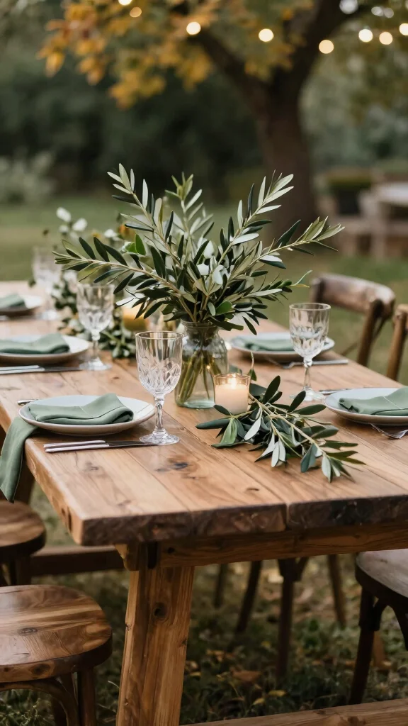 – Table settings with sage green napkins paired with rustic wooden accents