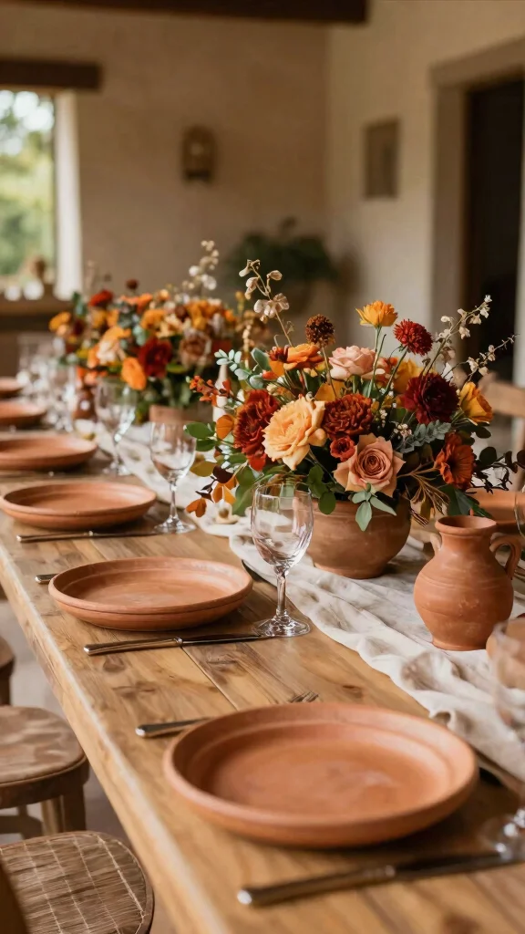 Terracotta shades work well for rustic themes and can be used in pottery or decor for an earthy vibe.