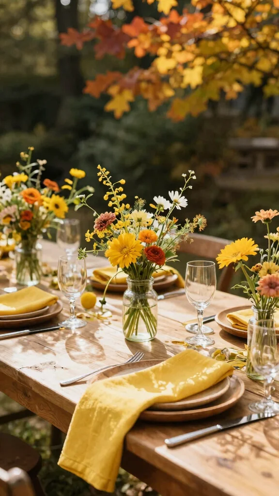 Use mustard yellow for vibrant accents to brighten your wedding decor and enhance the autumn atmosphere.