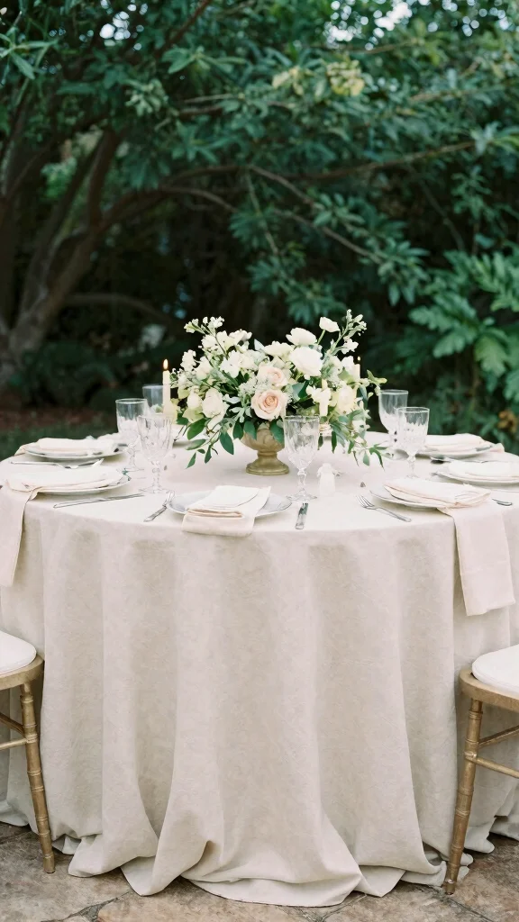 – Table settings adorned with ivory tablecloths and cream-colored florals
