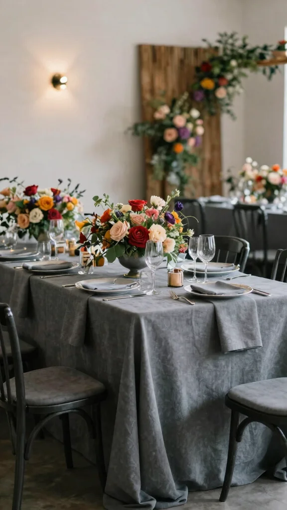 Charcoal grey is a modern and sophisticated choice that adds depth to your wedding aesthetic. This versatile color allows other hues to pop, making it ideal for contemporary rustic weddings.