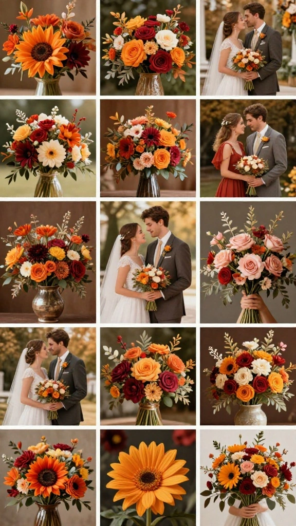 – Create bright bouquets with orange roses, marigolds, and seasonal foliage