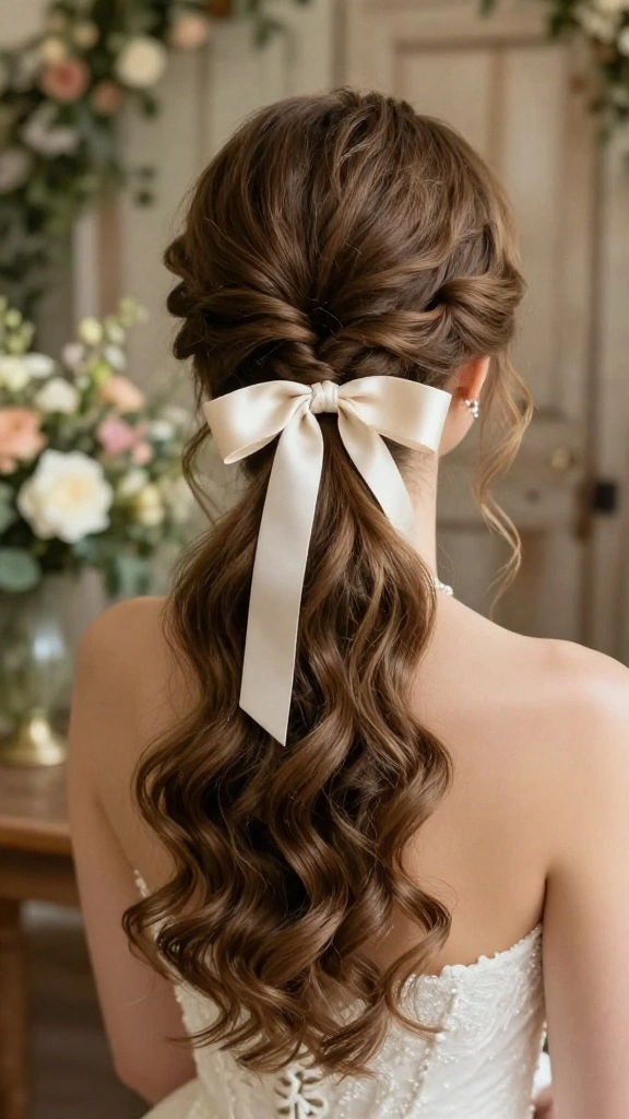 The classic side ponytail gains a charming twist with the addition of a ribbon. This sweet and timeless style is ideal for romantic weddings, offering a playful yet polished look. It’s a simple yet effective way to elevate your hairstyle for any special occasion.