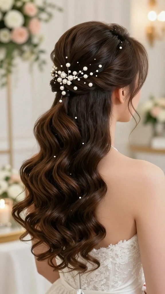 Elevate your side ponytail with luxurious pearl accents for a romantic and sophisticated look. This hairstyle is ideal for elegant weddings, bringing a refined touch to your bridesmaid style. The combination of soft waves and delicate pearls creates a timeless beauty.