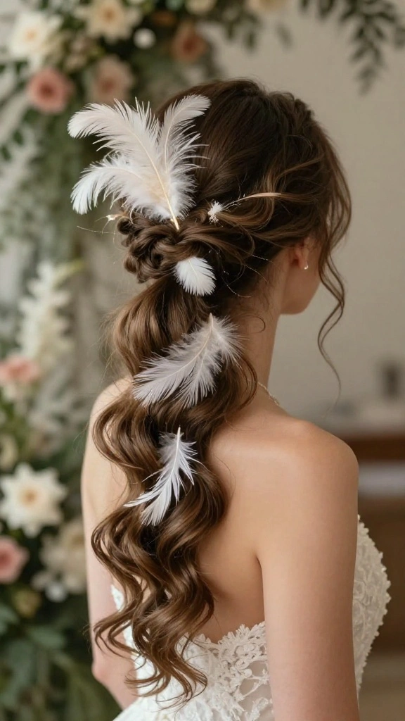 For a truly enchanting look, try a whimsical side ponytail adorned with feathers. This hairstyle combines fun and elegance, perfect for bridesmaids wanting to stand out. The addition of feathers provides a unique twist, making it an ideal choice for bohemian-themed weddings.
