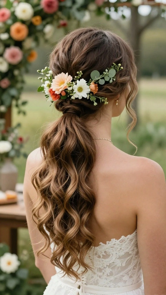 A side ponytail embellished with fresh flowers embodies a charming bohemian elegance. This style is perfect for outdoor weddings, exuding a romantic and whimsical feel. The combination of soft waves and delicate blooms makes for a stunning bridal party look.