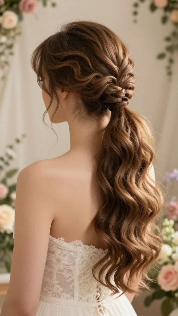 This hairstyle blends a relaxed side ponytail with soft, tousled waves and intricate braids, creating a beautifully textured look. It strikes the perfect balance between casual and refined, ideal for laid-back elegance. Whether you’re attending a garden wedding or a beach celebration, this style radiates effortless charm.