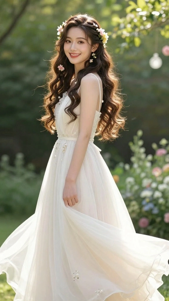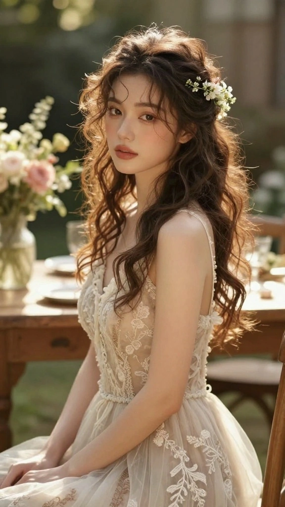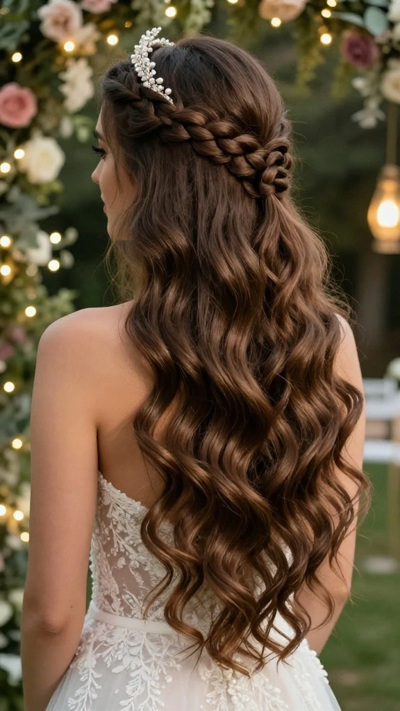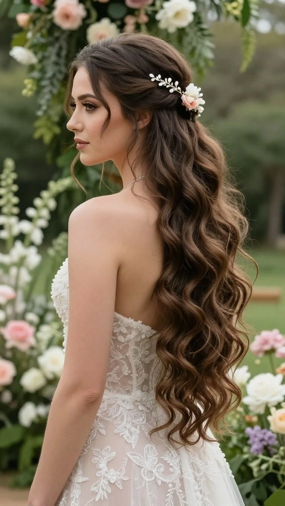 This hairstyle is perfect for outdoor weddings, adding a whimsical touch while maintaining elegance. You can easily switch to simple waves for a more classic appearance or add intricate braids for added detail.