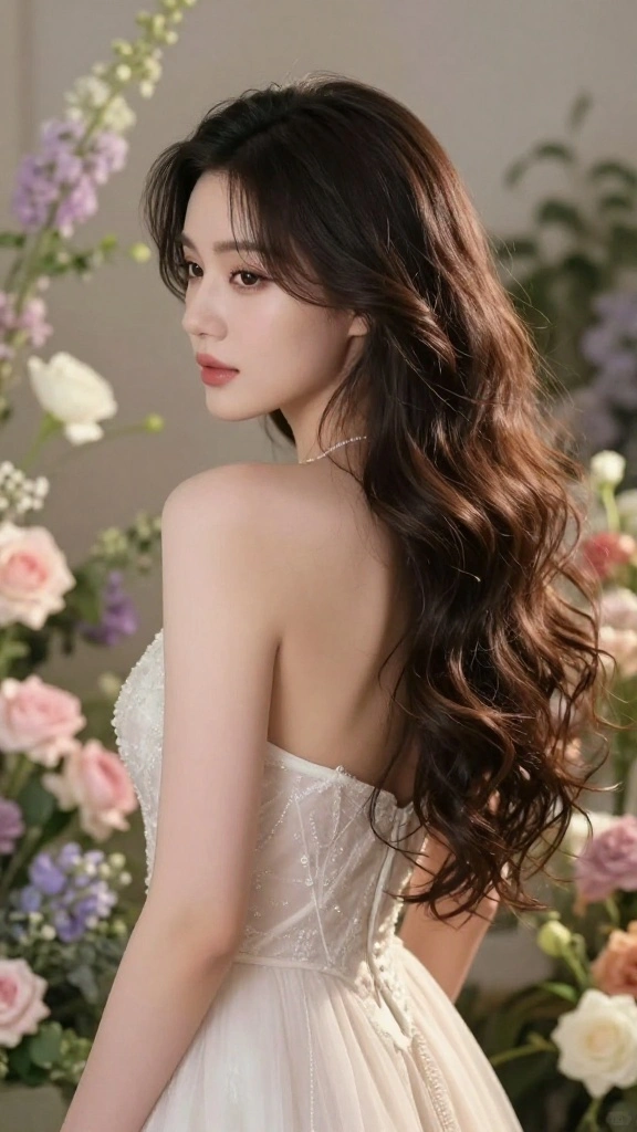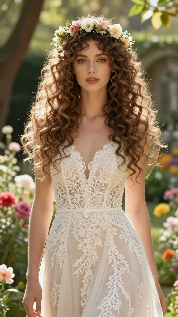 To achieve this style, start by curling your hair into soft waves. Then, adorn your hair with a floral crown made of fresh blooms or delicate faux flowers. The crown draws attention to your features and complements flowing gowns, creating a harmonious and enchanting appearance.
