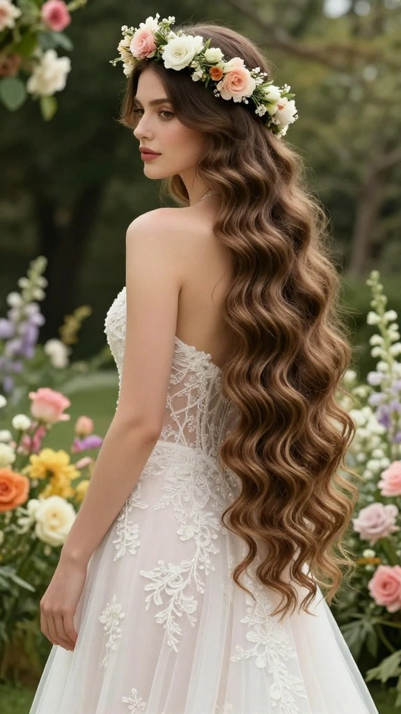 A floral crown paired with soft waves creates a whimsical and ethereal look, perfect for outdoor weddings. This hairstyle beautifully celebrates nature while adding a romantic touch, making it ideal for bohemian or rustic themes.