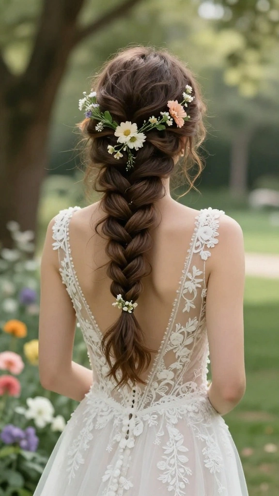 This hairstyle is perfect for outdoor celebrations and can be easily customized with different floral arrangements. You can adapt the look by switching to a loose bun for a more relaxed vibe.