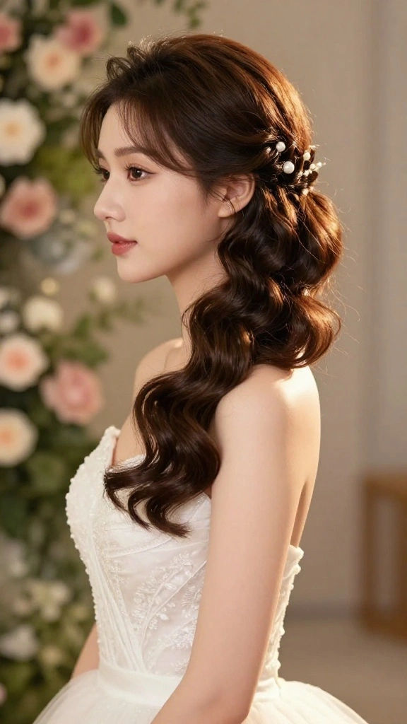 This hairstyle works beautifully with various accessories, whether you opt for delicate floral clips or sparkling pins. It enhances the romantic feel of your look, ensuring you feel beautiful and confident as you walk down the aisle. The combination of pinned and flowing hair is both playful and sophisticated.