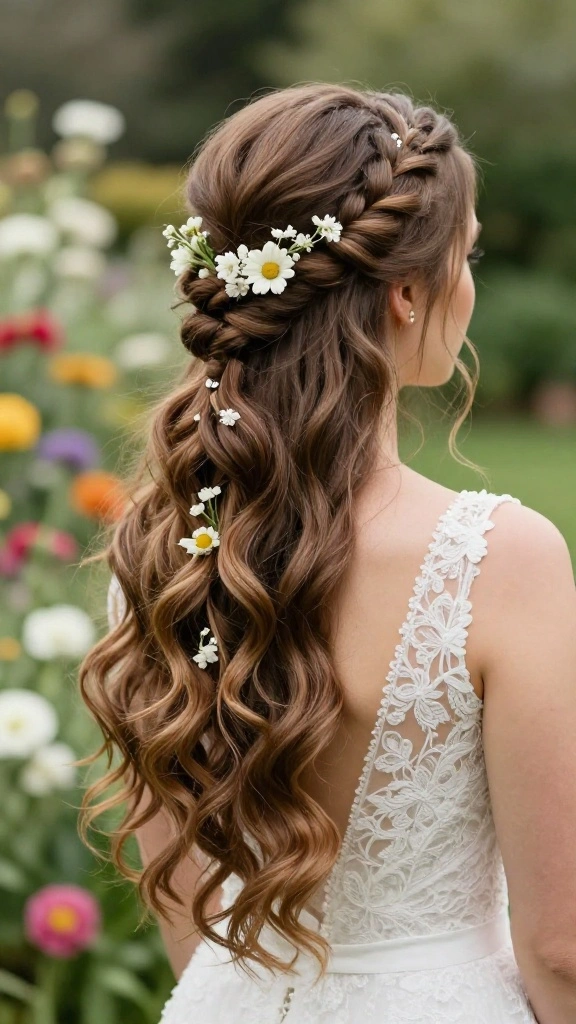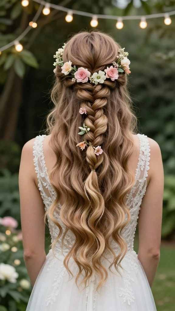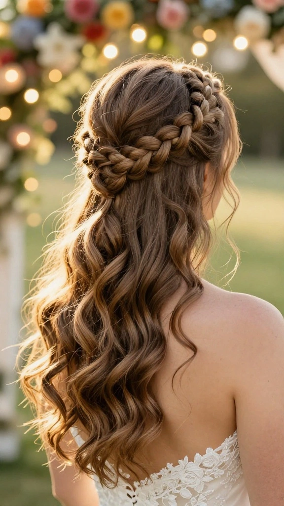 The twisted half-up braid is a beautifully elegant option for brides wanting a bohemian touch. This style combines the charm of a braid with the softness of loose hair, creating a stunning visual impact.