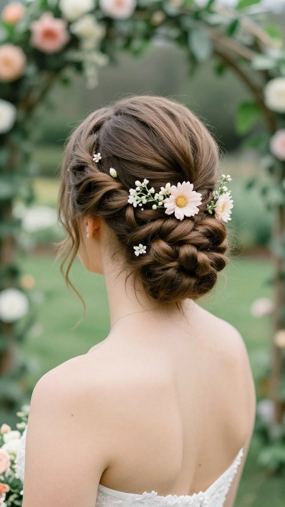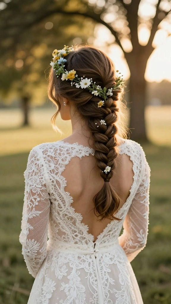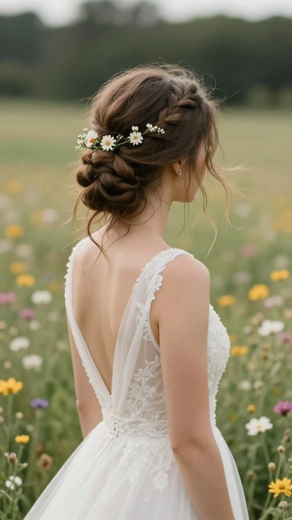 Fun fact: 76% of brides say a messy bun with braided accents stays flawless in outdoor ceremonies—an ideal pick among wedding braid hairstyles. Loose braids and floral pins boost bohemian charm while keeping it polished from ceremony to reception.