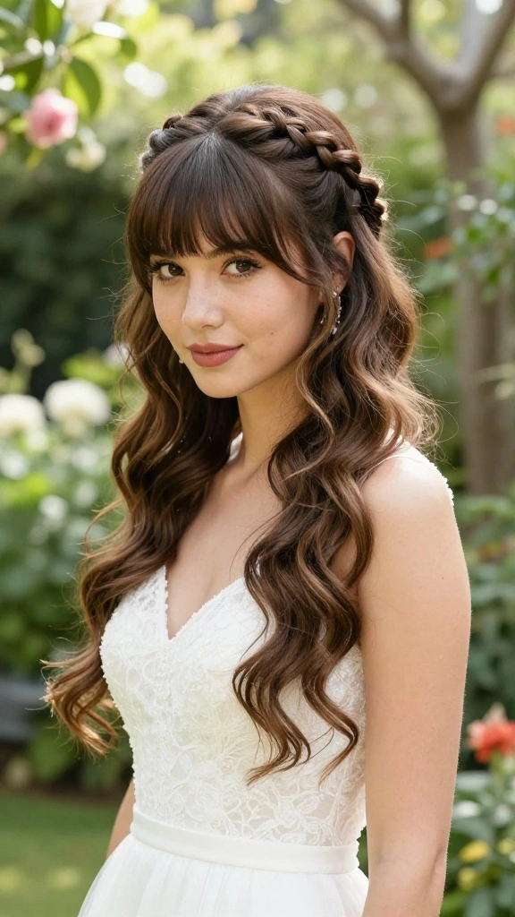The charm of braided bangs lies in their ability to add detail without overwhelming your look. They can be styled with loose wavy hair or incorporated into an updo for a polished finish. This playful hairstyle is ideal for the relaxed vibes of outdoor ceremonies.