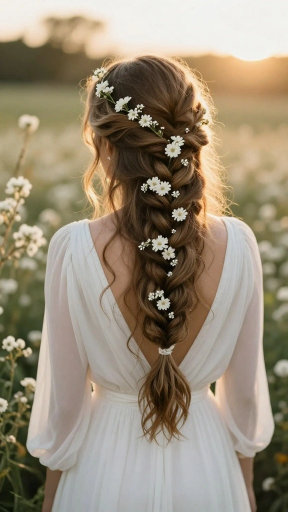 Adding floral accents transforms a Dutch braid into a stunning bohemian hairstyle, creating a striking visual contrast that’s perfect for outdoor settings. Wear it as a single braid cascading down your back or incorporate multiple braids into an elegant updo.