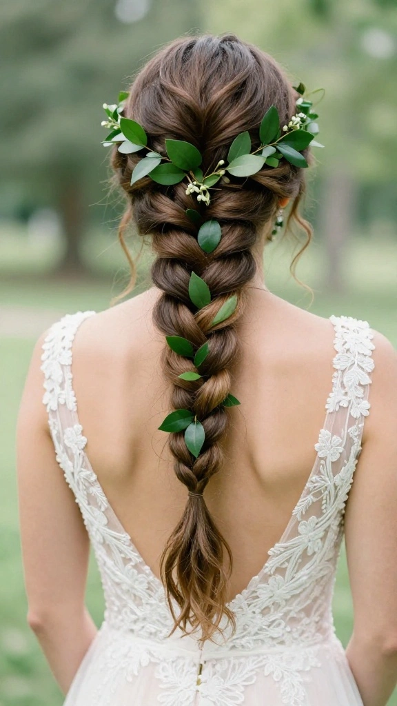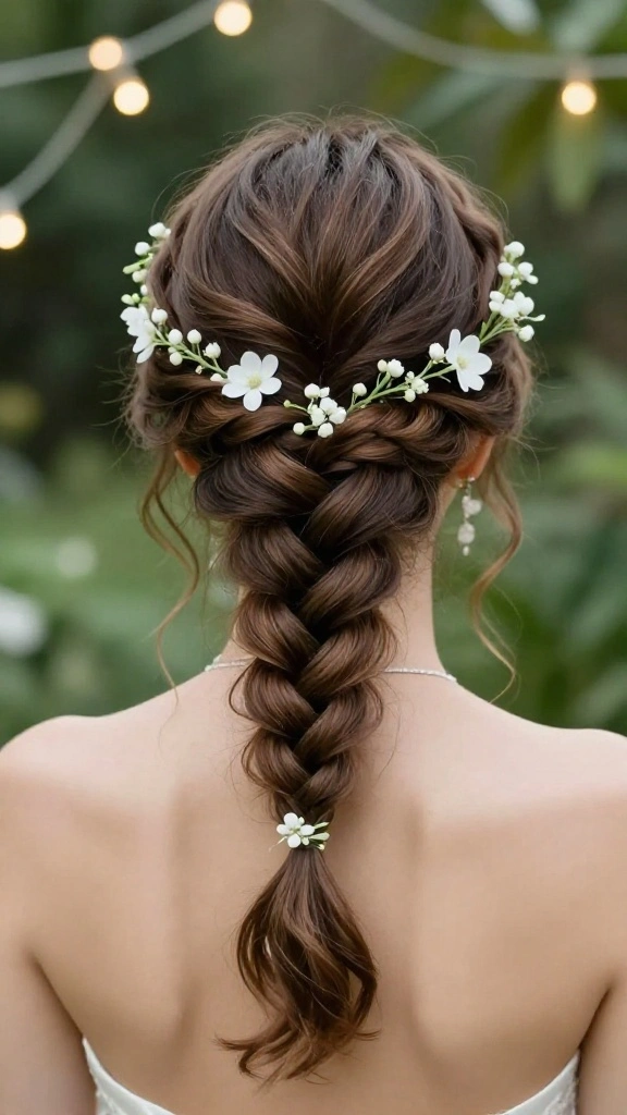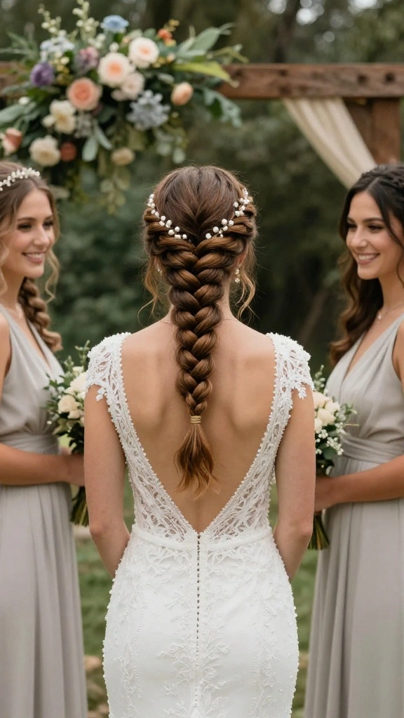 This braid shines at outdoor ceremonies and garden weddings, particularly when adorned with small florals or greenery. A few loose strands can frame your face, softening the overall look while complementing flowing dresses and natural waves.